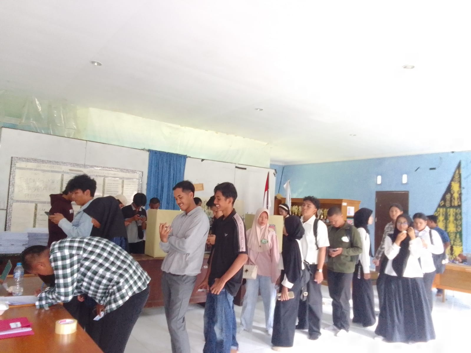 Selama pemilihan, kata Yaya tak ada paksaan dari kakak tingkatnya. “Yang penting jangan golput [golongan putih],” tambahnya. Meski antreannya cukup panjang, mahasiswa tetap tertib.